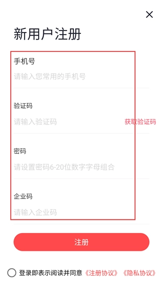 3、在新用户注册页面,按以下步骤操作:填写【号】、点击【获取验证码】、填写【验证码】、设置【密码】、填写【企业码】,最后点击【注册】按钮。