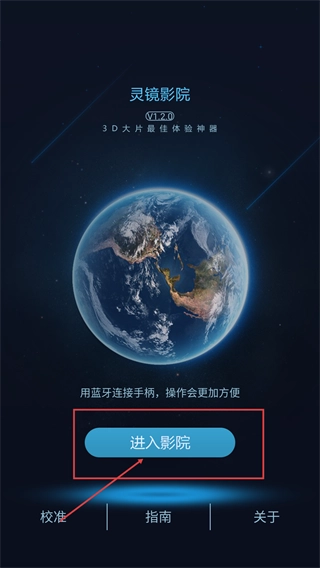 3、在【灵镜影院-V1.2.0】页面,可先通过蓝牙连接手柄以优化操作体验,随后点击【进入影院】,即可体验3D大片的相关功能。
