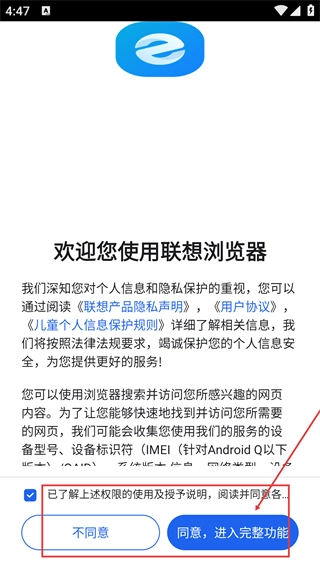 1、仔细阅读《联想产品隐私声明》《用户协议》等相关条款后,点击【同意,进入完整功能】按钮,就能进入联想浏览器的主界面。