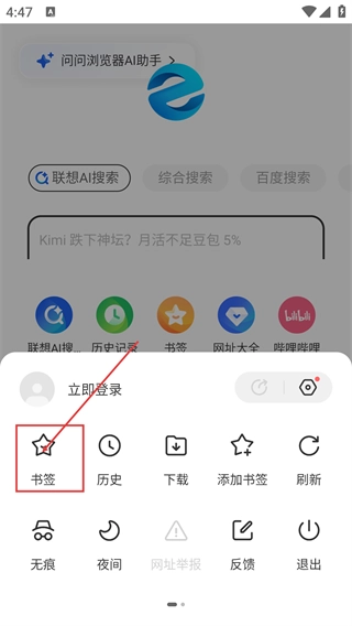 3、在展开的功能选项里,选择【书签】选项,就能进入书签管理页面,进行书签相关的操作。
