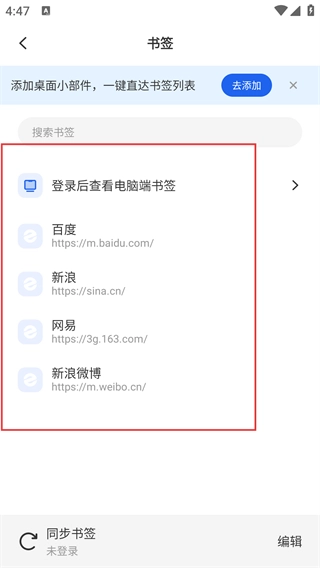 4、进入书签页面后,既能查看已添加的书签列表,也能借助搜索框查找书签,还可以开展同步书签等管理操作。