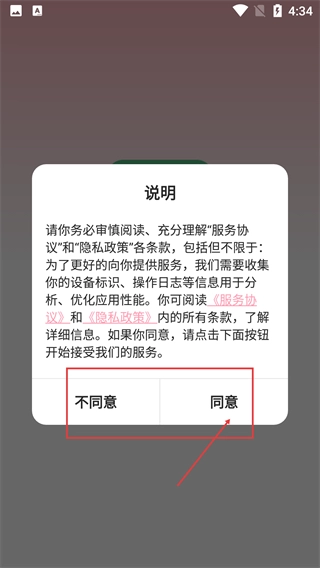 1、仔细阅读【服务协议】和【隐私政策】的说明内容,点击【同意】按钮,就能进入应用使用各项功能。