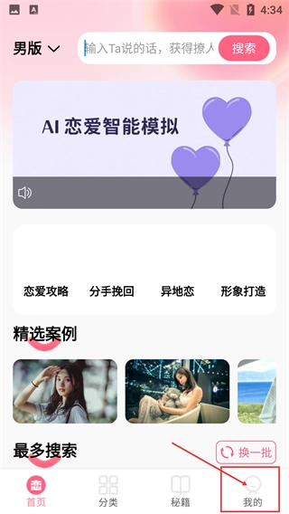 2、在AI恋爱智能模拟的首页,点击底部导航栏的【我的】按钮,即可进入个人功能相关页面。