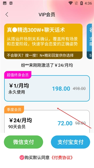 在VIP会员页面,你可以选择【超值终身会员】【季度会员】等不同套餐,然后通过微信支付或者支付宝支付的方式,完成会员开通的操作。