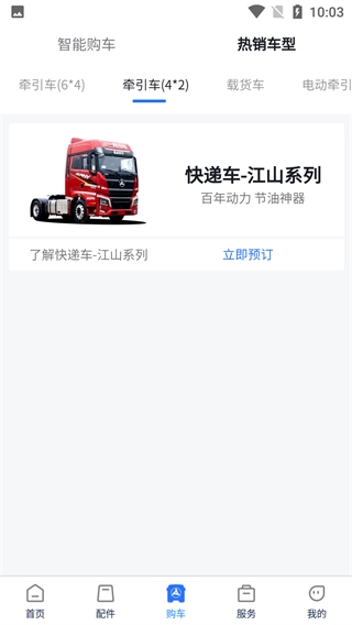 4、选择【牵引车(4*2)】分类后,能查看该类别下的车型(例如快递车-江山系列),点击【立即预订】即可开展车辆预订操作。