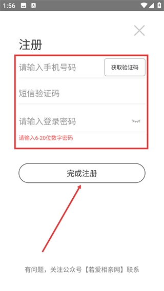 3、进入注册信息填写页面后,输入号码、获取并填写验证码,设置6-20位的数字密码,点击“完成注册”按钮,就能完成账号的创建。