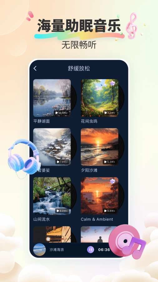 2、专业助眠白噪音、专业ASMR、神奇脑波与放松旋律,助力解决睡眠难题。
