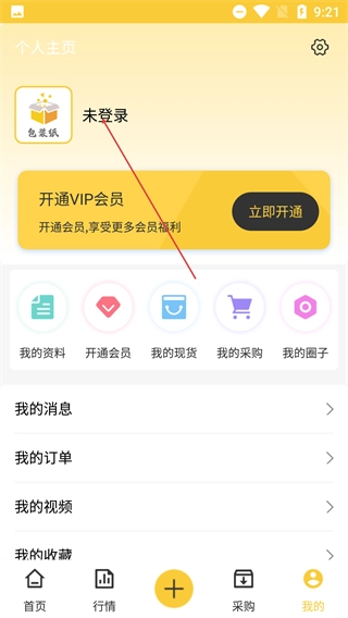 2、当个人主页处于【未登录】状态时,点击相应区域会触发登录流程,这样就能使用【我的现货】【我的采购】等功能了。