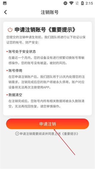3、仔细阅读《申请注销账号〈重要提示〉》后,勾选“同意”选项并点击【申请注销】按钮,此时会弹出注销确认的弹窗。
