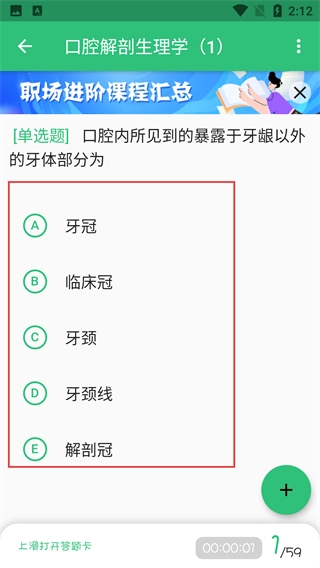 4、进入【口腔解剖生理学(1)】的单选题页面,这道题的答案是【临床冠】,也就是暴露在牙龈外面的牙体部分。