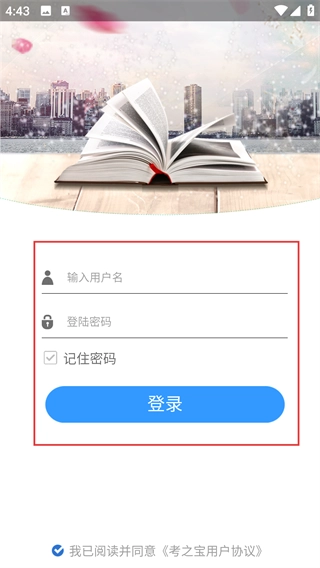 1、打开考之宝的登录界面,首先在“输入用户名”的输入框中填写相应账号,接着输入密码;信息填写完毕后,点击“登录”按钮就能进入应用。