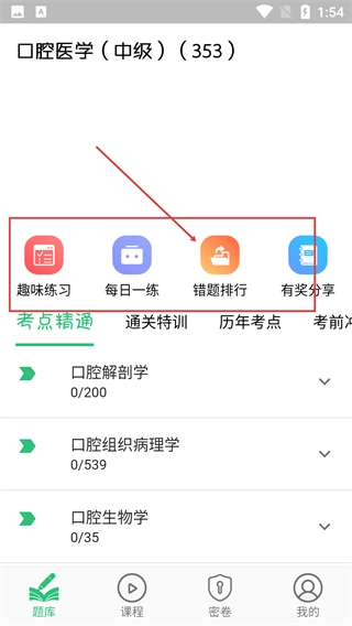 进入【口腔医学(中级)-353】板块后,能使用【趣味练习】【每日一练】等功能,还可以查看【口腔解剖学-0/200】等科目的进度。