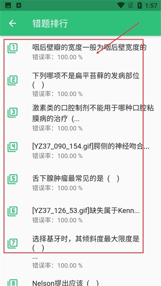3、进入【错题排行】页面后,能够查看错误率达到100.00%的错题列表,其中包含像【咽后壁瓣的宽度一般为咽后壁宽度的】这类题目。
