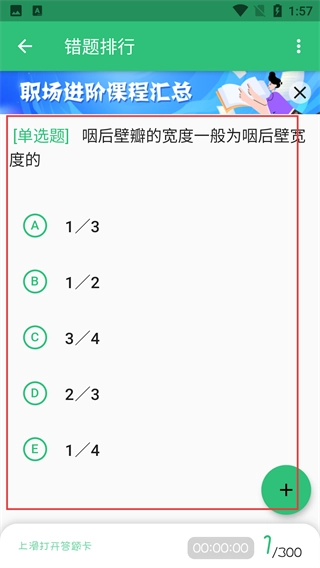 4、点击【错题排行】里的题目,会进入单选题答题界面,处理像【咽后壁瓣的宽度一般为咽后壁宽度的】这类题目。