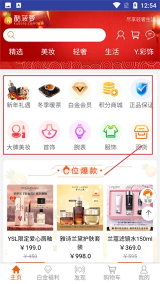 1、在【酷菠萝】主页找到并点击【百货】选项,进入百货板块后,点击查看【新品推荐】,即可浏览各类商品并推进购物相关操作流程。