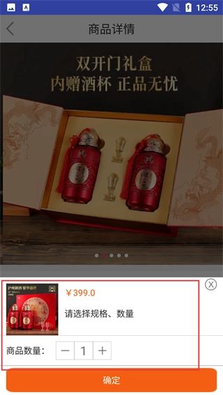 4、在商品详情页弹出的选择框中,确认商品数量后点击【确定】按钮,完成规格与数量的选择操作,以推进购物流程。