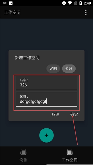 4、在弹出的窗口中选择连接方式(WIFI或蓝牙),填写“名字”和“区域”信息后,点击【确定】按钮,即可完成工作空间的创建。
