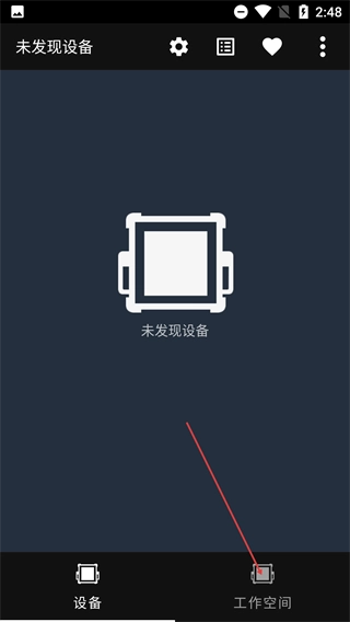 2、进入显示“未发现设备”的“设备”页面后,点击底部的【工作空间】选项,即可切换至工作空间界面。