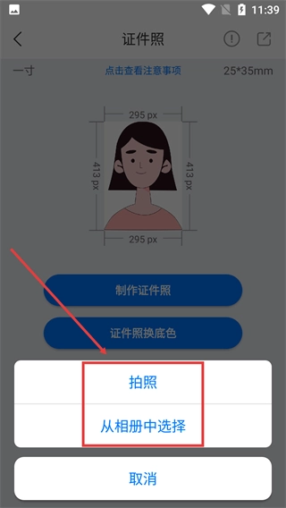 4、待弹出选项框后,从中选择【拍照】或【从相册中选择】,获取照片来制作对应尺寸的证件照。
