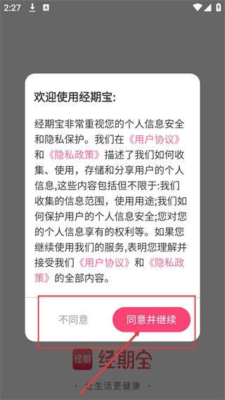 1、仔细阅读《用户协议》与《隐私政策》后,点击欢迎弹窗里的【同意并继续】按钮,即可进入经期宝应用的首页。