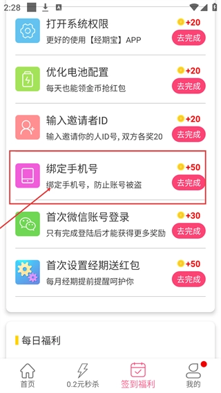 3、在签到福利页面找到【绑定号】任务,点击右侧的【去完成】按钮,触发号验证的弹窗。