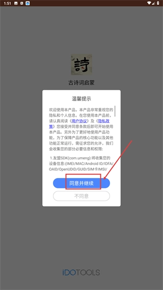 1、在“古诗词启蒙”的温馨提示弹窗中,阅读《用户协议》和《隐私政策》后,点击【同意并继续】按钮,即可启用产品功能。