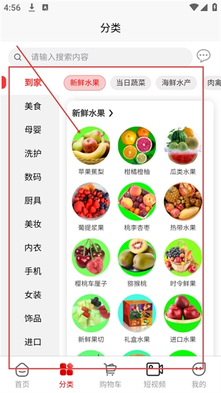 2、在分类页面,先选择“到家”分类标签,再选择“新鲜水果”子分类,接着点击“苹果蕉梨”对应的分类入口,即可进入该类目的商品列表页面。
