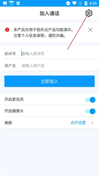 1、进入【加入通话】页面后,需填写【房间号】和【用户名】,同时可以设置麦克风、摄像头的状态,点击右上角的齿轮图标就能进入设置页面。
