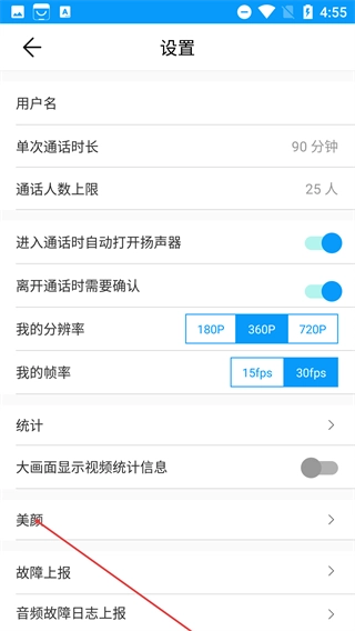 2、在【设置】页面中,你可以查看通话时长、人数上限等相关配置,也能够调整分辨率和帧率,点击【美颜】选项即可进入美颜设置界面。