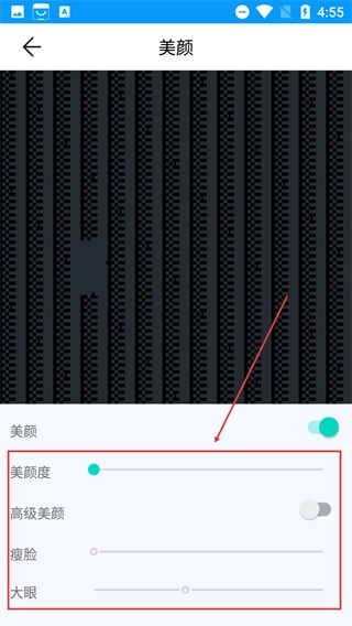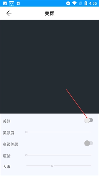 3、进入【美颜】设置页面,默认情况下美颜功能是关闭的,你可以通过开关按钮来开启美颜,并且还能对美颜度、瘦脸等参数进行调整。