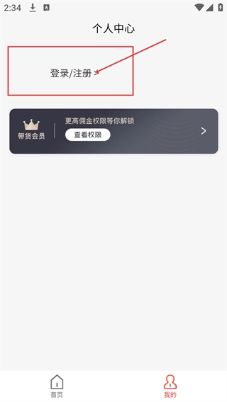 2、进入个人中心页面后,点击【登录/注册】区域,页面将跳转至登录界面,从而开启账号的登录或注册流程。
