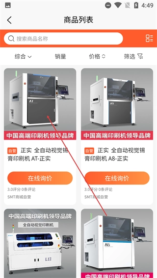 3、在商品列表页面,用户能够借助排序和筛选功能来浏览各类设备(例如全自动视觉锡膏印刷机),挑选出目标商品后即可进入其详情页面。