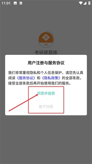 1、仔细阅读【服务协议】和【隐私政策】的所有条款后,点击【同意并接受】按钮,就能进入考研原题库使用相关服务。