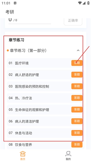 2、在【章节练习-第一部分】的列表里,找到并选定目标小节(例如【医疗环境】),然后点击该小节右侧的【答题】按钮,即可进入对应的练习页面。