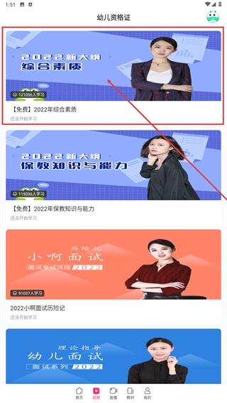 2、进入幼儿资格证页面后,点击【视频课】选项,即可进入课程列表页面。