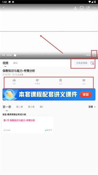 4、在课程播放页面,你可以观看视频、发送弹幕进行互动,也能使用“点赞”“收藏”等功能,并且可以领取配套的讲义和课件。