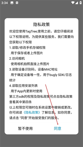 1、打开【TagTree】应用后,仔细阅读其【隐私政策】里涉及存储、相机等权限的相关说明,确认无误后点击【同意】按钮,即可进入账号操作界面。
