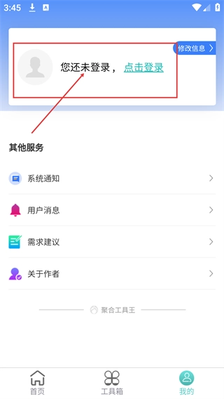 3、在【我的】页面里,点击【您还未登录,点击登录】的区域就能进入登录流程,这个页面还包含【系统通知】、【用户消息】等服务选项。