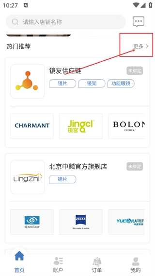 2、在首页的【热门推荐】板块中点击【更多】按钮,即可查看完整的供应商列表,从而拓宽眼镜采购时可选择的合作方范围。