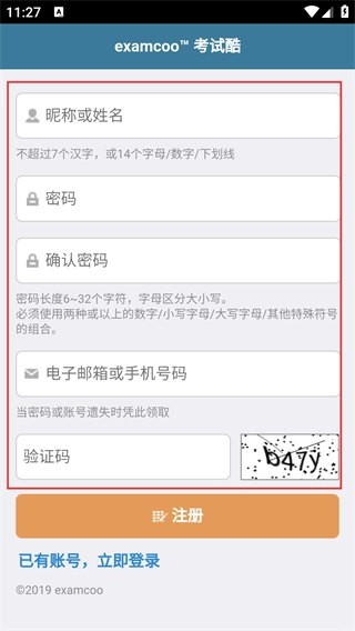 2、在【examcoo-考试酷】的注册页面,填写【昵称或姓名】【密码】等必填信息,输入验证码后点击【注册】按钮,即可完成账号注册流程。