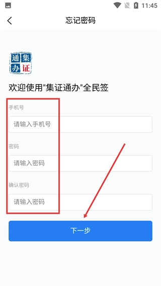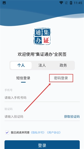 1、进入“集证通办”全民签登录界面,选择【密码登录】选项,切换到密码登录对应的信息输入页面。