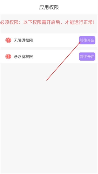 4、进入【应用权限】页面后,找到【无障碍权限】和【悬浮窗权限】,分别点击它们对应的【前往开启】按钮,开启这些必要权限,以确保应用能够正常运行。