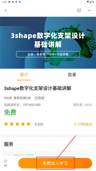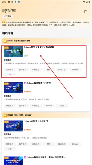 3、进入数字化口腔路线详情页面后,点击阶段1下的【3shape数字化支架设计基础讲解】课程,查看课程重点及相关标签。