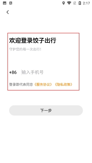 3、进入【欢迎登录饺子出行】页面,在【+86】后输入号码,完成登录操作,可点击“下一步”按钮推进登录流程。