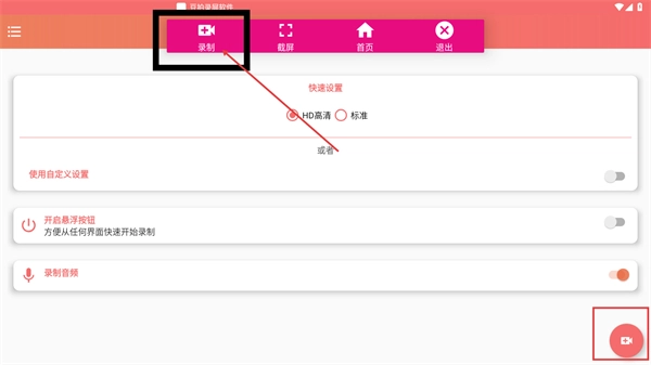 1、进入录屏设置界面后,先选择合适的画质(例如HD高清),接着点击顶部的【录制】按钮(也可以点击右下角的录制按钮),即可开启录屏流程。