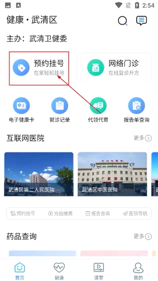 1、在【健康·武清区】首页,点击【预约挂号-在家轻松导】进入挂号流程,该页面包含【电子健康卡】等功能,主办单位为【武清卫健委】。