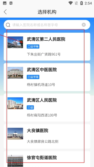 2、进入【选择机构】页面后,您可以通过搜索功能查找,或者直接选择【武清区第二人民医院】、【武清区中医医院】等机构,查看这些机构的等级信息和具体地址,以便推进挂号流程。