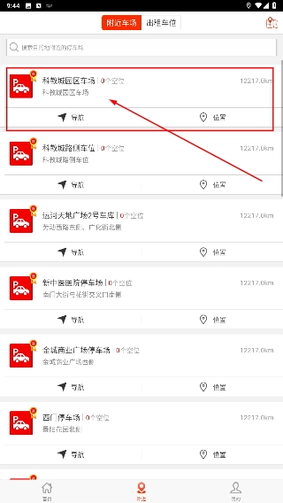 2、在车位列表中,选择目标停车场选项(例如“科教城园区停车场”),即可进入该停车场的详情页面。