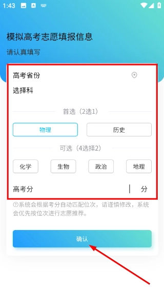 1、在模拟高考志愿填报界面,需先选定【高考省份】,接着选择报考的科目,输入【高考分数】后,系统将依据这些信息为你推荐志愿。