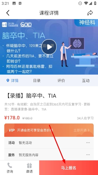 4、在【课程详情】页面,浏览课程信息后点击【马上报名】按钮,就能完成课程报名流程。